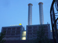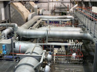 Nach diesen generellen Erläuterungen fuhren wir mit einem Aufzug zunächst hinauf zum Leitstand (Warte). Von hier aus wird das gesamte Kraftwerk überwacht und gesteuert, so daß im Normalfall auch nur hier Betriebspersonal anzutreffen ist. Von der Warte aus gelangten wir über eine gut isolierende Tür in die Kraftwerkshalle, direkt hindurch zwischen einem der Abhitzekessel und einem Speisewasserbehälter. Sowohl Lautstärke als auch Temperatur erhöhten sich schlagartig, so daß sich schon nach kurzer Zeit Schweißperlen auf der Stirn bildeten.